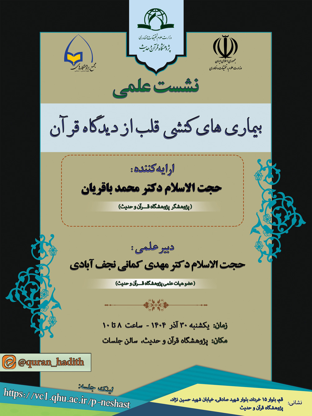 به گزارش روابط عمومی پژوهشگاه قرآن و حدیث، همزمان با هفته پژوهش 1404 و به مناسبت هفته پژوهش و در راستای ششمین همایش علوم انسانی – اسلامی نشست علمی با موضوع: "بیماری های کنشی قلب از دیدگاه قرآن" از سلسله نشست های علمی پژوهشگاه قرآن و حدیث با همکاری و مشارکت مجمع پژوهشگاه های علوم انسانی - اسلامی و وزارت علوم، تحقیقات و فناوری و با حضور حجت الاسلام دکتر محمد باقریان؛ پژوهشگر پژوهشگاه قرآن و حدیث به عنوان ارائه کننده و حجت الاسلام دکتر مهدی کمانی نجف آبادی؛ عضو هیأت علمی پژوهشگاه قرآن و حدیث به عنوان دبیر نشست در روز یکشنبه 30 آذر ماه 1404 از ساعت 8 تا 10 به صورت حضوری و وبیناری در سالن جلسات پژوهشگاه قرآن و حدیث برگزار می شود.
