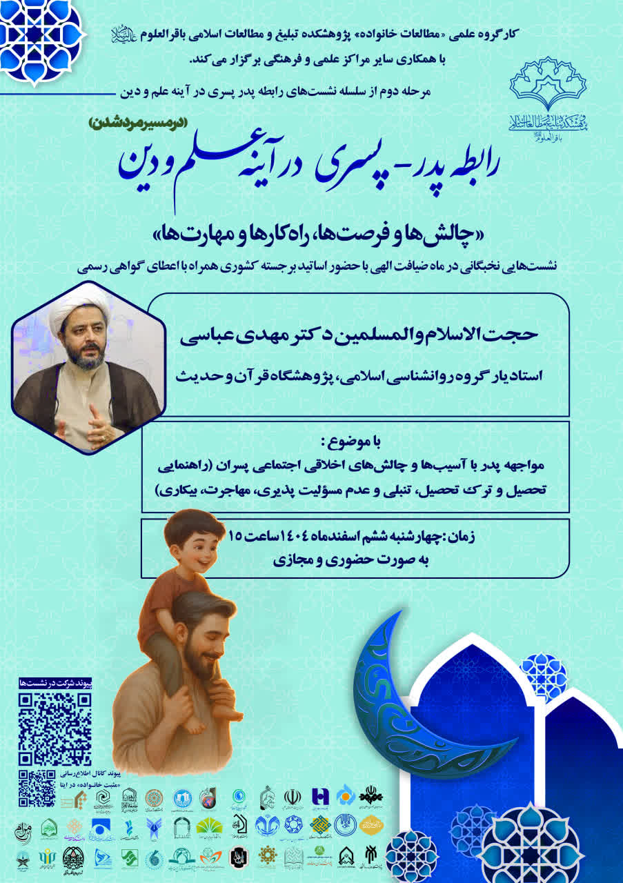 لازم به ذکر است همزمان با ایام ماه مبارک رمضان 1404، مرحله دوم سلسله‌ نشست‌های علمی با موضوع " رابطه پدر_پسری در آیینه علم و دین" به همت کارگروه علمی مطالعات خانواده پژوهشکده تبلیغ و مطالعات اسلامی و با همکاری پژوهشگاه قرآن و حدیث و سایر مراکز علمی با حضور اساتید برجسته حوزه و دانشگاه با روایتی نخبگانی و میان‌رشته‌ای از رابطه پدر پسری و با تمرکز بر بازخوانی علمی و دینی نقش پدر در  تربیت هویتی، اخلاقی و اجتماعی پسران  و نیز پرورش مردانی مسئولیت‌پذیر، توانمند و اثرگذار و با رویکردهای متنوع علمی؛ اخلاق و تربیت، روان‌شناسی و مشاوره، جامعه‌شناسی، رسانه و فرهنگ همراه با اعطای گواهی از روز شنبه 2 تا 27 اسفند ماه 1404 ساعت 15  به صورت حضوری و وبیناری در سالن جلسات پژوهشکده باقر العلوم علیه السلام برگزار می شود.