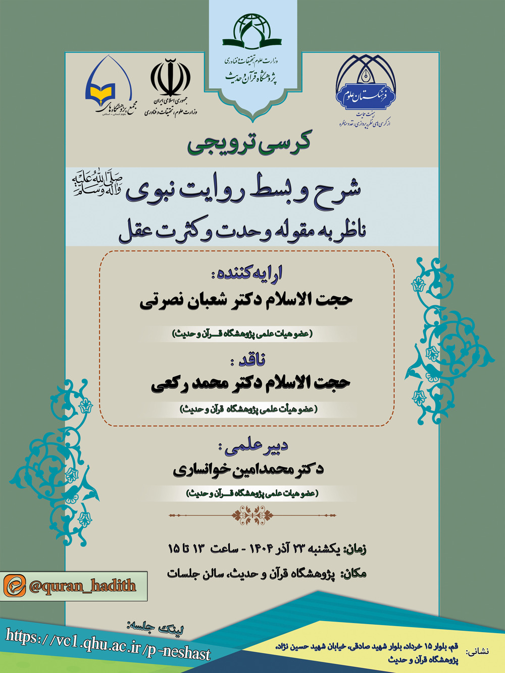 وبحسب تقرير العلاقات العامة فی معهد القرآن والحديث، فإن هذا الكرسي العلمي يأتي بمناسبة مرور ألف وخمسمائة عام على ولادة النبي الأعظم (صلى الله عليه وآله وسلم)، وفي إطار المؤتمر السادس للعلوم الإنسانية – الإسلامية والبحث والتكنولوجيا تحت شعار "مدرسة وسيرة النبي الأعظم (صلى الله عليه وآله وسلم): علوم إنسانية إسلامية تبني الإنسان والمجتمع". وسيشارك في هذا اللقاء حجة الإسلام الدكتور شعبان نصرتي، عضو الهيئة العلمية للمعهد كمقدّم، وحجة الإسلام والمسلمين الدكتور محمد ركعي، عضو الهيئة العلمية للمعهد كناقد، والدكتور محمد أمين خوانساري، عضو الهيئة العلمية للمعهد كأمين للجلسة، وذلك يوم الأحد 23 آذر 1404 من الساعة 13 إلى 15، حضورياً وعن بُعد، في قاعة الاجتماعات التابعة للمعهد