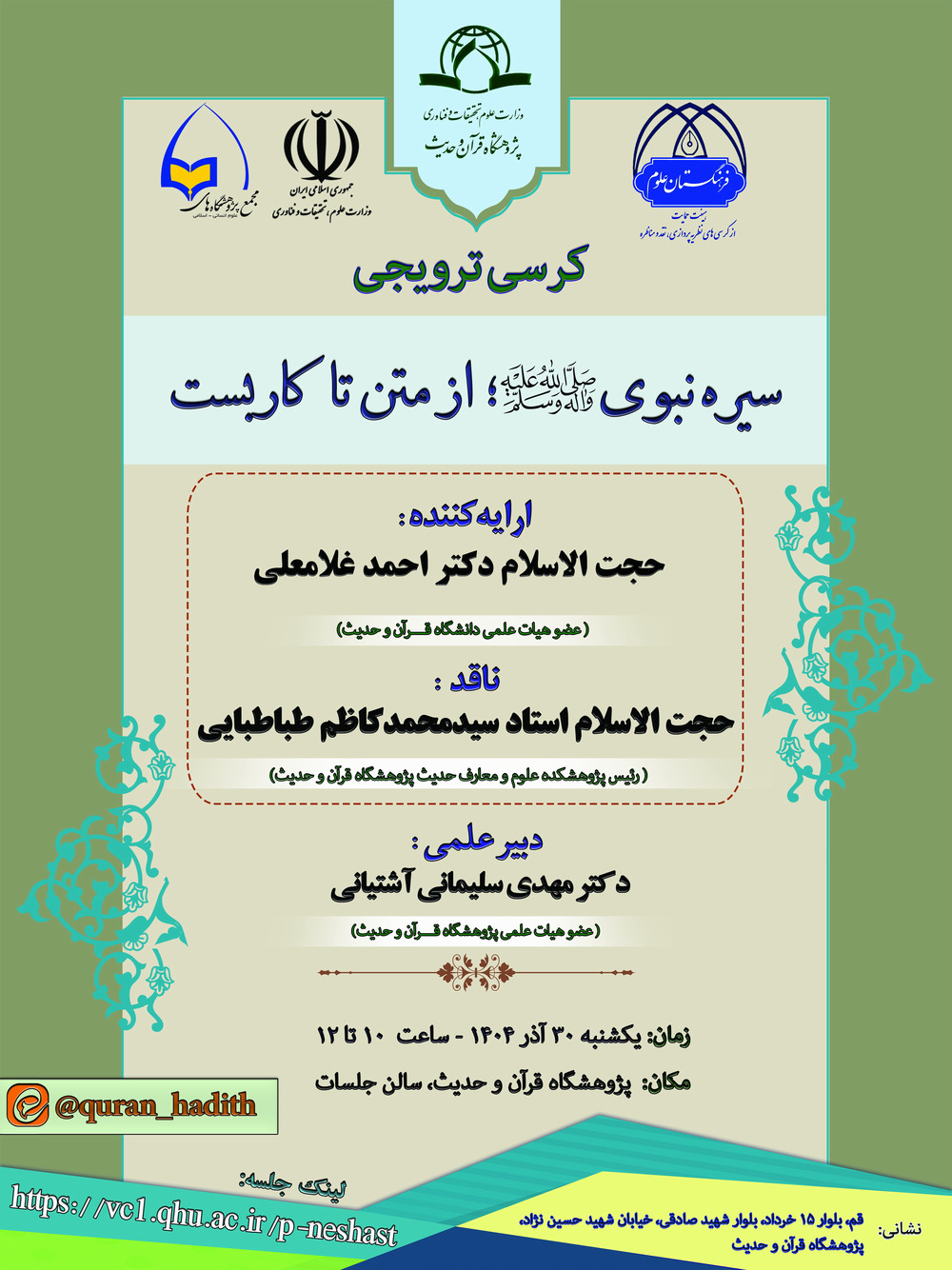 وبحسب تقرير العلاقات العامة فی معهد القرآن والحديث، فإن هذا الكرسي العلمي يأتي بمناسبة مرور ألف وخمسمائة عام على ولادة النبي الأعظم (صلى الله عليه وآله وسلم)، وفي إطار المؤتمر السادس للعلوم الإنسانية الإسلامية والبحث والتكنولوجيا تحت شعار "مدرسة وسيرة النبي الأعظم (صلى الله عليه وآله وسلم): علوم إنسانية إسلامية تبني الإنسان والمجتمع". وسيشارك في هذا اللقاء حجة الإسلام الدكتور أحمد غلامعلي، عضو الهيئة العلمية لجامعة القرآن والحديث كمقدّم، وحجة الإسلام والمسلمين الأستاذ السيد محمد كاظم طباطبائي، رئيس مركز علوم ومعارف الحديث كناقد، والدكتور مهدي سليماني آشتیاني، عضو الهيئة العلمية للمعهد كأمين للجلسة، وذلك يوم الأحد 30 آذر 1404 من الساعة 10 إلى 12، حضورياً وعن بُعد، في قاعة الاجتماعات التابعة للمعهد