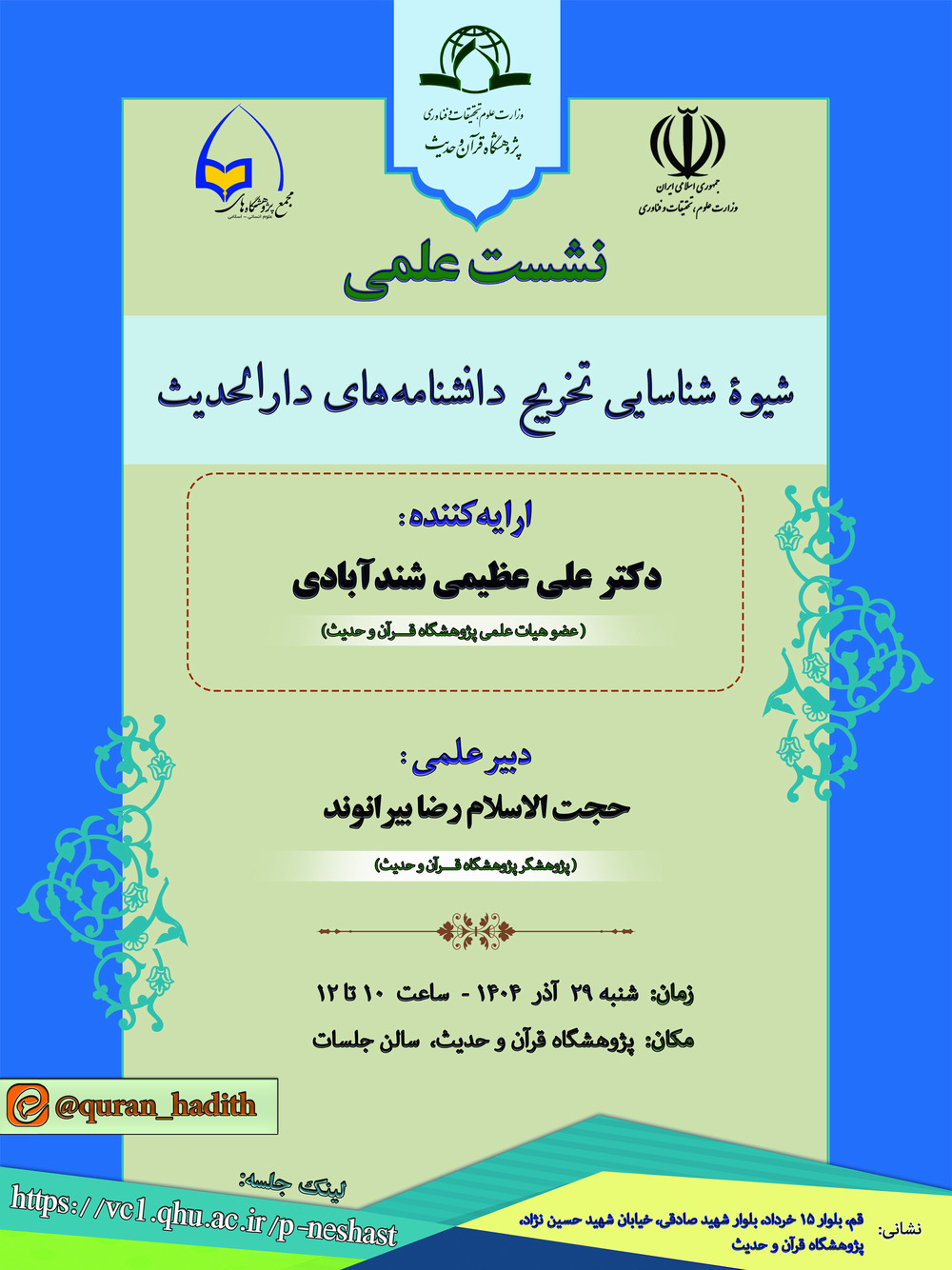 وبالتزامن مع أسبوع البحث، ينظم معهد القرآن والحديث هذا اللقاء بالتعاون مع مجمع معاهد العلوم الإنسانية – الإسلامية ووزارة العلوم والبحوث والتكنولوجيا
