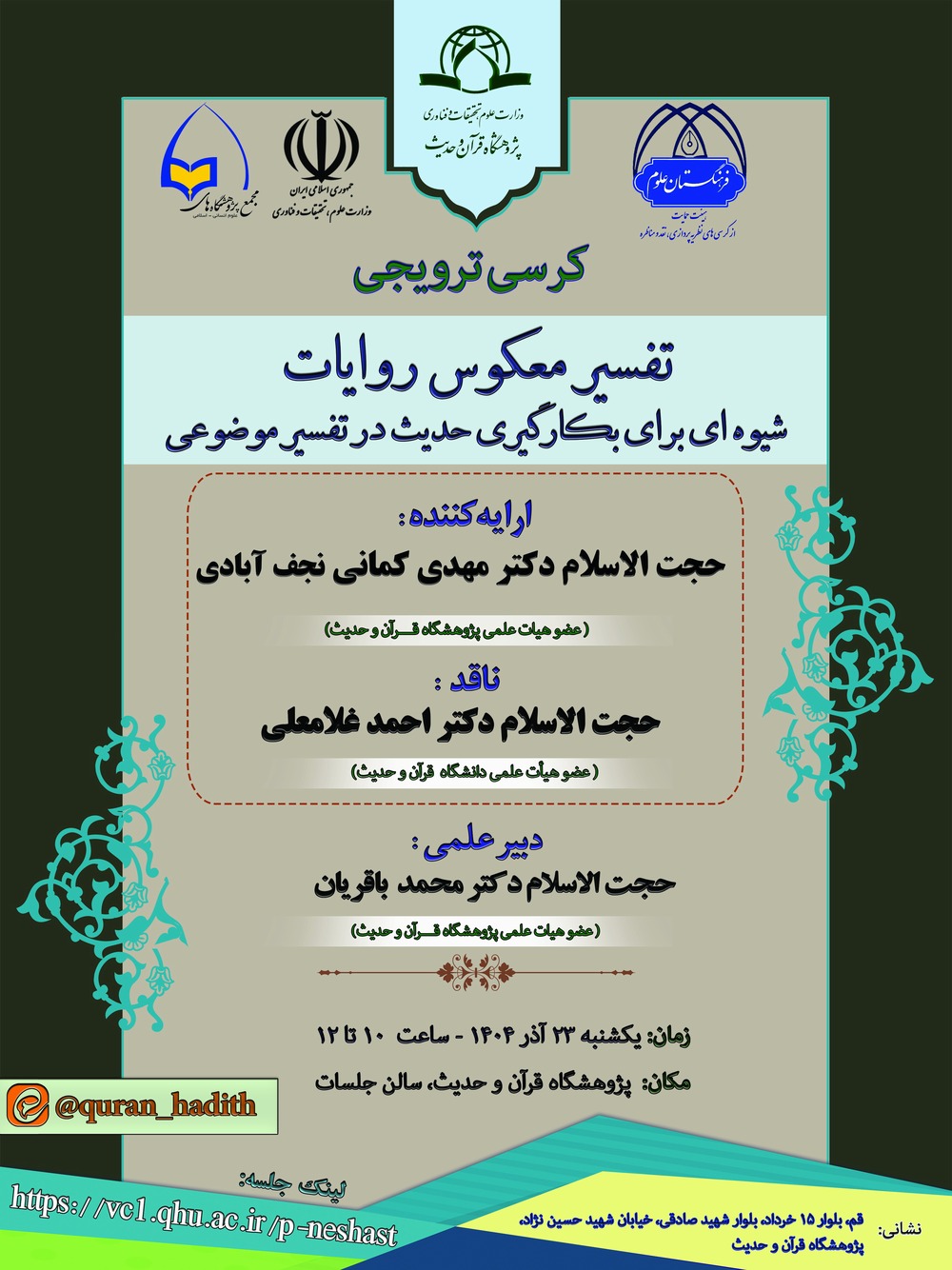 The promotional academic chair entitled Reverse Interpretation of Narrations as a Method for Employing Hadith in Thematic Exegesis will be held