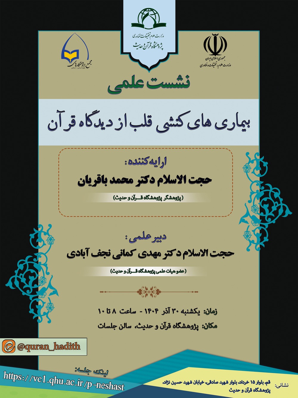 According to the Public Relations Office of the Quran and Hadith Research Institute, this session is part of the Institute’s series of scientific meetings within the framework of the Sixth Conference on Humanities–Islamic Studies, Research, and Technology. The session will feature Hojjat al-Islam Dr. Mohammad Baqerian, researcher at the Institute of Quran and Hadith, as the presenter, and Hojjat al-Islam Dr. Mehdi Kamani Najafabadi, faculty member of the Institute, as the session secretary. It will be held on Sunday, December 21, 2025 (30 Azar 1404), from 8:00 to 10:00, both in-person and online, at the Conference Hall of the Institute of Quran and Hadith.