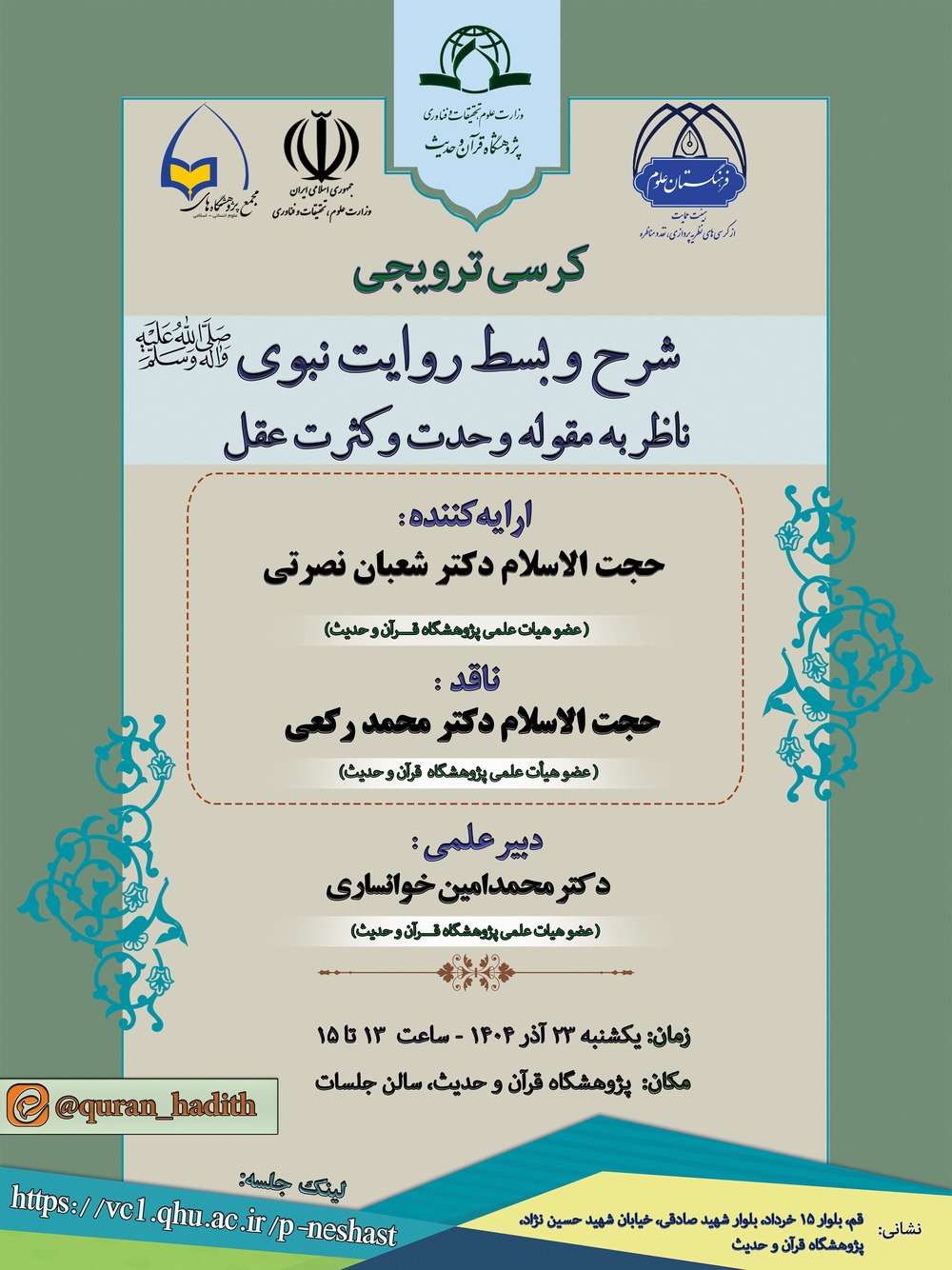According to the Public Relations Office of the Quran and Hadith Research Institute, this academic chair is being held on the occasion of the 1500th anniversary of the birth of the Holy Prophet (peace be upon him and his family), within the framework of the Sixth Conference on Humanities–Islamic Studies, Research, and Technology, under the theme: "The School and Biography of the Holy Prophet (peace be upon him and his family): Islamic Humanities that Build Individuals and Societies." The session will feature Hojjat al-Islam Dr. Shaban Nosrati, faculty member of the Institute of Quran and Hadith, as the presenter; Hojjat al-Islam wal-Muslimeen Dr. Mohammad Rokai, faculty member of the Institute, as the critic; and Dr. Mohammad Amin Khansari, faculty member of the Institute, as the session secretary. It will be held on Sunday, December 14, 2025 (23 Azar 1404), from 13:00 to 15:00, both in-person and online, at the Conference Hall of the Institute of Quran and Hadith.