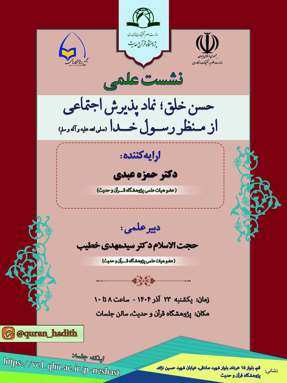 According to the Public Relations Office of the Quran and Hadith Research Institute, this session is being held on the occasion of the 1500th anniversary of the birth of the Holy Prophet (peace be upon him and his family), within the framework of the Sixth Conference on Humanities–Islamic Studies, Research, and Technology, under the theme: "The School and Biography of the Holy Prophet (peace be upon him and his family): Islamic Humanities that Build Individuals and Societies." The session will feature Dr. Hamzeh Abdi, faculty member of the Institute of Quran and Hadith, as the presenter, and Hojjat al-Islam Dr. Seyyed Mehdi Khatib, faculty member of the Institute, as the session secretary. It will be held on Sunday, December 14, 2025 (23 Azar 1404), from 8:00 to 10:00, both in-person and online, at the Conference Hall of the Institute of Quran and Hadith