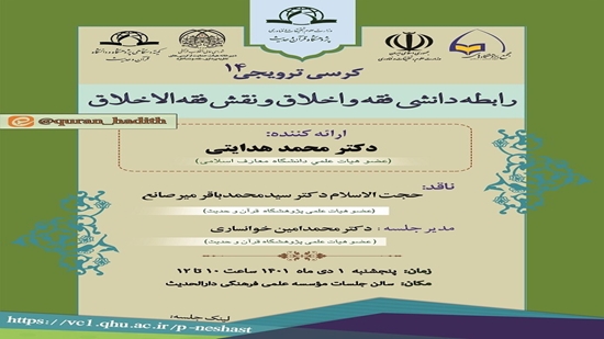 به گزارش روابط عمومی پژوهشگاه قرآن و حدیث، همزمان با هفته پژوهش و در راستای سومین همایش علوم انسانی – اسلامی، پژوهش و فناوری، کرسی علمی ترویجی "رابطه دانشی فقه و اخلاق و نقش فقه الاخلاق" از سلسله کرسی های ترویجی پژوهشگاه قرآن و حدیث و با مشارکت معاونت پژوهشی وزارت علوم، تحقیقات و فناوری و مجمع پژوهشگاه های علوم انسانی – اسلامی و دبیرخانه هیات حمایت از کرسی های نظریه پردازی، نقد و مناظره شورای عالی انقلاب فرهنگی، با ارائه و سخنرانی دکتر محمد هدایتی، عضو هیات علمی دانشگاه معارف اسلامی و با حضور حجت الاسلام دکتر سیدمحمدباقر میرصانع، عضو هیات علمی پژوهشگاه قرآن و حدیث به عنوان ناقد و دکتر محمدامین خوانساری، عضو هیات علمی پژوهشگاه قرآن و حدیث به عنوان مدیر جلسه، در روز پنجشنبه ۱  دی ماه ۱۴۰۱ از ساعت ۱۰ تا ۱۲به صورت حضوری و وبیناری در سالن جلسات موسسه علمی فرهنگی دارالحدیث برگزار می شود.