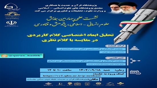 به گزارش روابط عمومی پژوهشگاه قرآن و حدیث، همزمان با هفته پژوهش  ۱۴۰۲ در راستای چهارمین همایش علوم انسانی – اسلامی، پژوهش و فناوری، اولین نشست از سلسله نشست های علمی پژوهشگاه با عنوان "تحلیل ابعاد اختصاصی کلام کاربردی در مقایسه با کلام نظری"با سخنرانی حجت الاسلام دکتر مسلم محمدی، دانشیار دانشگاه تهران و با دبیری حجت الاسلام دکتر سیدمحمدباقر میرصانع، عضو هیات علمی پژوهشگاه قرآن و حدیث، با مشارکت و همکاری مجمع پژوهشگاه های علوم انسانی - اسلامی و وزارت علوم، تحقیقات و فناوری، در روز شنبه ۱۸ آذر ماه ۱۴۰۲ از ساعت ۱۰ تا ۱۲به صورت حضوری و وبیناری در سالن جلسات پژوهشگاه قرآن و حدیث برگزار می شود.