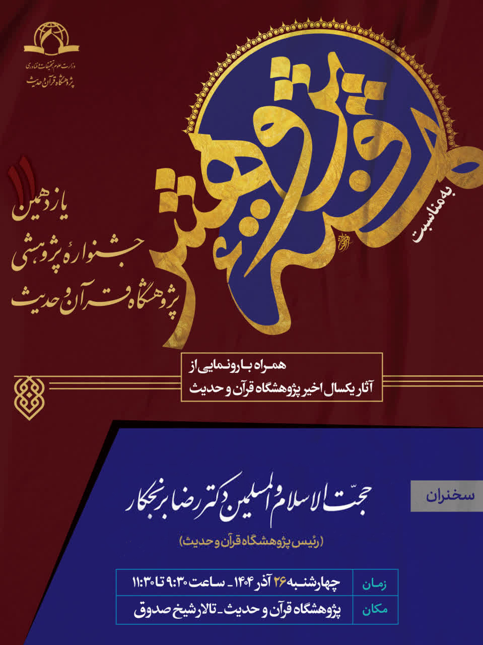 به گزارش روابط عمومی پژوهشگاه قرآن و حدیث، همزمان با هفته پژوهش، یازدهمین جشنواره پژوهشی پژوهشگاه قرآن و حدیث با هدف تجلیل و تقدیر از پژوهشگران برگزیده پژوهشگاه با سخنرانی حجت الاسلام و المسلمین دکتر رضا برنجکار؛ رئیس پژوهشگاه قرآن و حدیث در روز چهار شنبه 26 آذر 1404 از ساعت 9:30 تا 11:30 در تالار شیخ صدوق (ره) پژوهشگاه برگزار می شود.