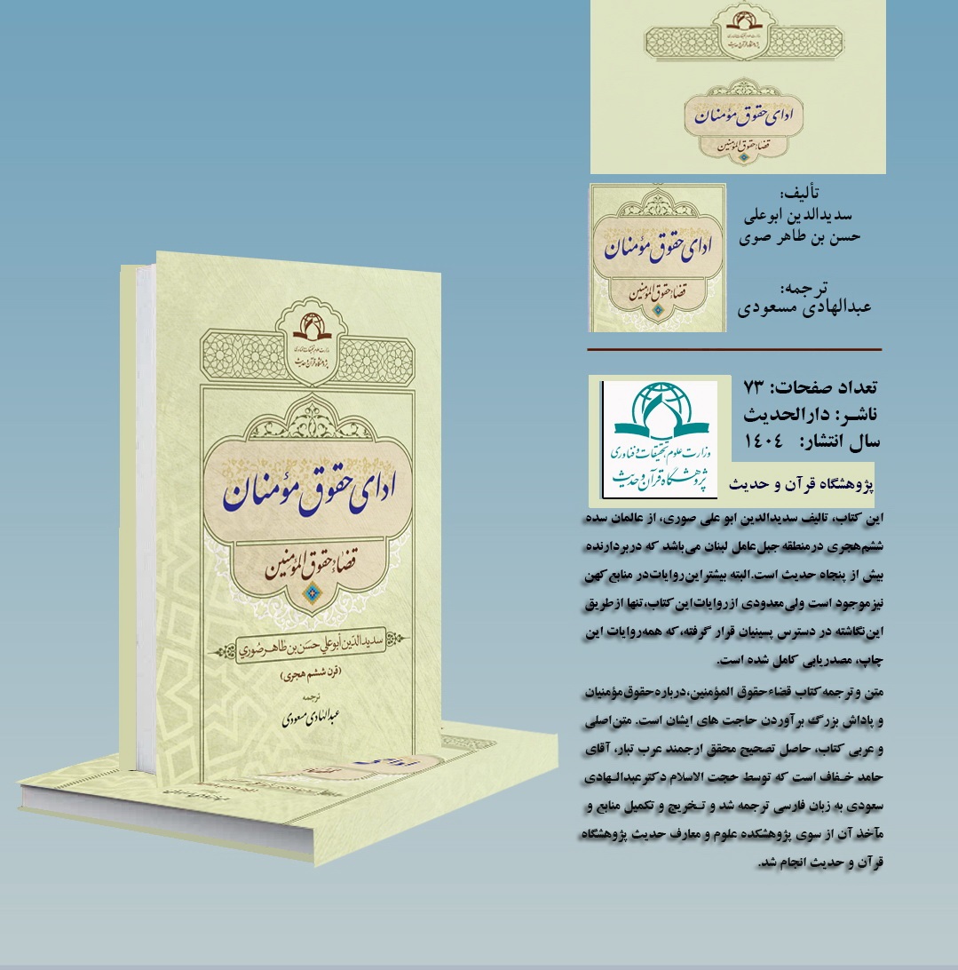 کتاب "ادای حقوق مؤمنان" تالیف سدید الدین ابوعلی حسن بن طاهر صوری با ترجمه فارسی حجت الاسلام دکتر عبدالهادی مسعودی، به زبان فارسی – عربی در قطع رقعی و در 73 صفحه به نگارش درآمده است و در سال 1404 با همکاری انتشارات دارالحدیث منتشر شده است.