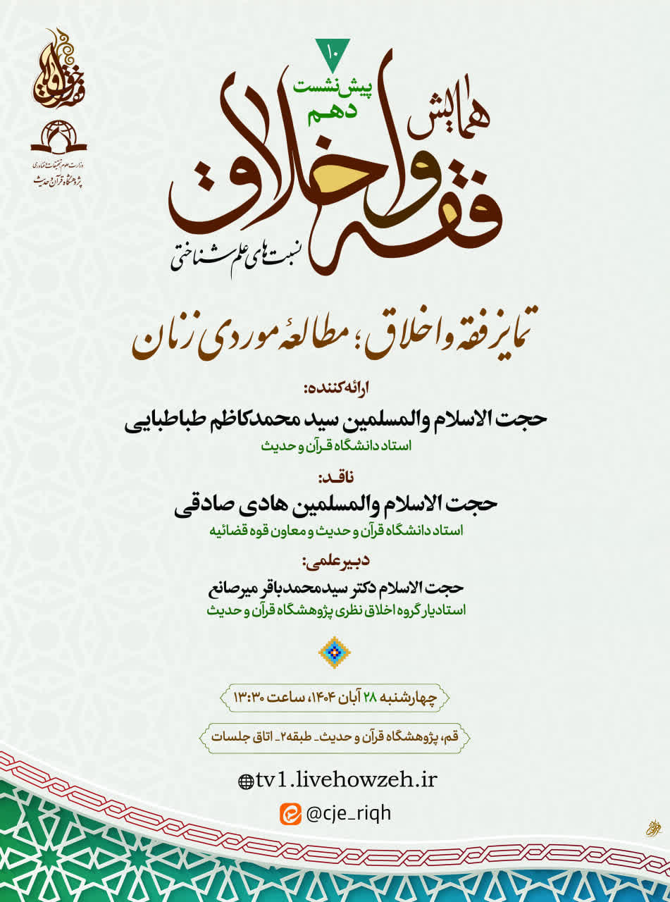 بحسب تقرير العلاقات العامة في معهد القرآن والحديث، ستُعقد الجلسة العلمية التحضيرية العاشرة للمؤتمر الوطني «الفقه والأخلاق: النسبية المعرفية» وذلك تحت عنوان: تمييز الفقه عن الأخلاق: دراسة حالة في سياق النساء.