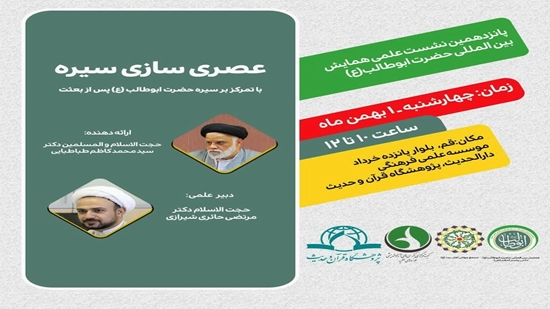 به گزارش روابط عمومی پژوهشگاه قرآن و حدیث، نشست علمی "عصری سازی سیره با تمرکز بر سیره حضرت ابوطالب علیه السلام پس از بعثت" پانزدهمین نشست از سلسله نشست های علمی همایش بین المللی حضرت ابوطالب علیه السلام؛ حامی پیامبر اعظم صلی الله علیه و آله و سلم  با مشارکت پژوهشگاه قرآن و حدیث و دبیرخانه همایش بین المللی حضرت ابوطالب علیه السلام و مجمع جهانی اهل بیت علیهم السلام با سخنرانی حجت الاسلام و المسلمین استاد سیدمحمدکاظم طباطبایی، رئیس پژوهشکده علوم و معارف حدیث  و با دبیری حجت الاسلام دکتر مرتضی حائری شیرازی در روز چهارشنبه ۱بهمن ماه از ساعت ۱۰  تا ۱۲به صورت وبیناری در سالن جلسات موسسه علمی فرهنگی دارالحدیث برگزار می شود.