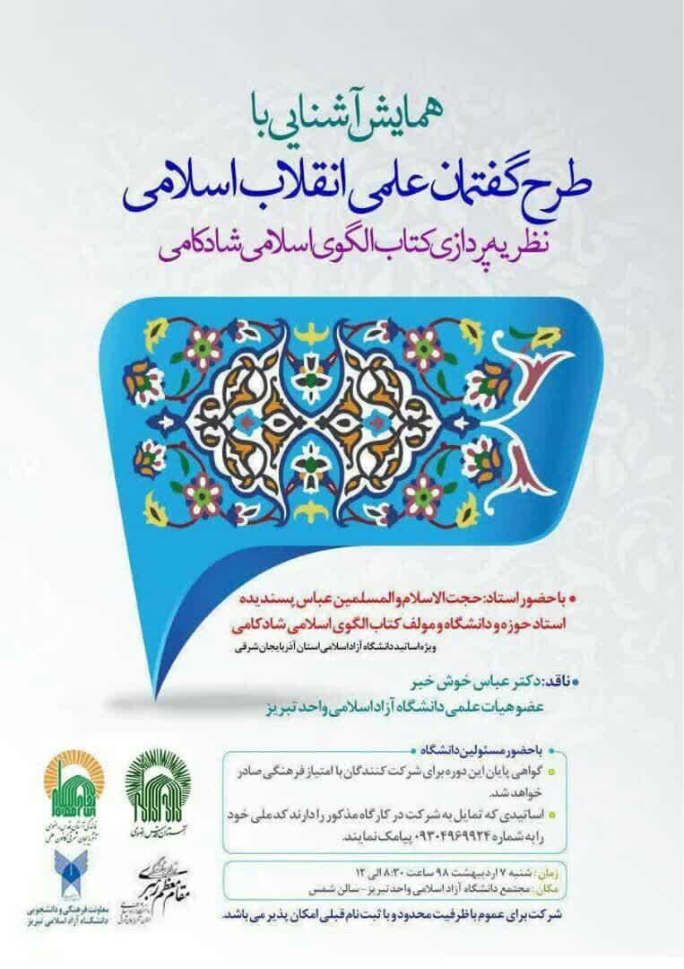 همایش آشنایی با طرح گفتمان علمی انقلاب اسلامی با عنوان "نظریه پردازی کتاب الگوی اسلامی شادکامی" ویژه اساتید دانشگاه آزاد اسلامی استان آذربایجان شرقی به همت دانشگاه آزاد اسلامی تبریز و بنیاد پژوهش های اسلامی آستان قدس رضوی و دبیرخانه انجمن های علمی حوزه برگزار شد.