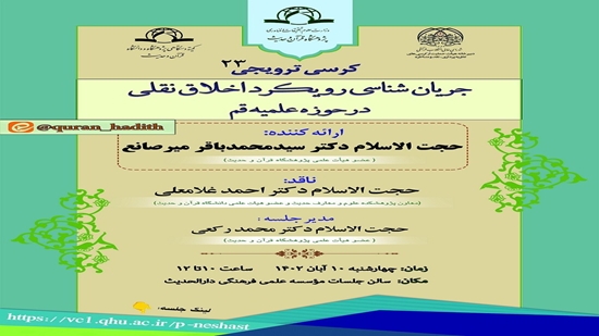 به گزارش روابط عمومی پژوهشگاه قرآن و حدیث، کرسی علمی ترویجی "جریان شناسی رویکرد اخلاق نقلی درحوزه علمیه قم" به همت پژوهشکده اخلاق و روان شناسی اسلامی پژوهشگاه قرآن و حدیث با همکاری دبیرخانه هیات حمایت از کرسی های نظریه پردازی، نقد و مناظره شورای عالی انقلاب فرهنگی، با ارائه و سخنرانی دکتر سیدمحمدباقر میرصانع، عضو هیات علمی پژوهشگاه قرآن و حدیث و با حضور حجت الاسلام دکتر احمد غلامعلی، معاون پژوهشکده علوم و معارف حدیث و عضو هیات علمی دانشگاه قرآن و حدیث به عنوان ناقد و حجت الاسلام دکتر محمد رکعی، عضو هیات علمی پژوهشگاه قرآن و حدیث به عنوان مدیر جلسه، در روز چهارشنبه ۱۰ آبان ماه ۱۴۰۲ از ساعت ۱۰ تا ۱۲ به صورت حضوری و وبیناری در سالن جلسات موسسه علمی فرهنگی دارالحدیث برگزار می شود.
