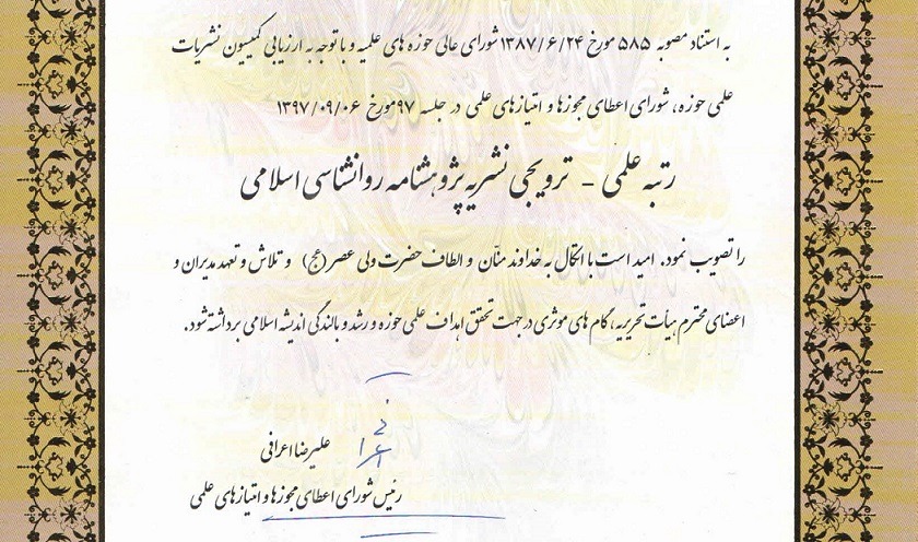کسب رتبه علمی ترویجی مجله پژوهش نامه روان شناسی اسلامی از شورای اعطای مجوزها و امتیازهای علمی حوزه
