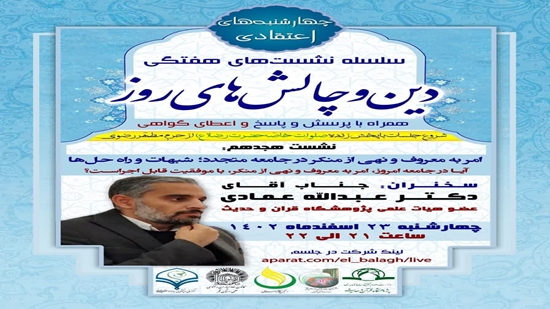 به گزارش روابط عمومی پژوهشگاه قرآن و حدیث، نشست علمی"امر به معروف و نهی از منکر در جامعه متجدد؛ شبهات و راه حل ها" با طرح پرسش "آیا در جامعه امروز امر به معروف و نهی از منکر با موفقیت قابل اجراست؟" از هجدهمین نشست از سلسله جلسات و نشست های "دین و چالش های روز" ویژه "چهارشنبه های اعتقادی" از سوی پژوهشگاه قرآن و حدیث، انجمن کلام اسلامی حوزه، کمیته مرکزی کرسی های آزاداندیشی حوزه های علمیه و مرکز آموزش های کاربردی دفتر تبلیغات اسلامی قم با ارائه و سخنرانی دکتر عبدالله عمادیعضو هیات علمی پژوهشگاه قرآن و حدیث در روز چهارشنبه ۲۳ اسفند ماه ۱۴۰۲ از ساعت ۲۱ تا ۲۲ به صورت وبیناری برگزار می شود.