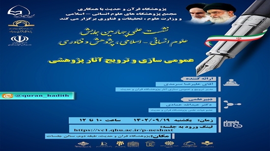 به گزارش روابط عمومی پژوهشگاه قرآن و حدیث، همزمان با هفته پژوهش ۱۴۰۲ در راستای چهارمین همایش علوم انسانی – اسلامی، پژوهش و فناوری، دومین نشست از سلسله نشست های علمی پژوهشگاه با عنوان "عمومی سازی و ترویج آثار پژوهشی"با ارائه آقای علیرضا سرمدی، مدیر ترویج و عمومی سازی آثار پژوهشگاه قرآن و حدیث و با دبیری دکتر عبدالله عمادی، عضو هیات علمی پژوهشگاه قرآن و حدیث، با مشارکت و همکاری مجمع پژوهشگاه های علوم انسانی - اسلامی و وزارت علوم، تحقیقات و فناوری، در روز یکشنبه ۱۹ آذر ماه ۱۴۰۲ از ساعت ۱۰ تا ۱۲به صورت حضوری و وبیناری در سالن جلسات پژوهشگاه قرآن و حدیث برگزار می شود.
