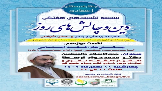 به گزارش روابط عمومی پژوهشگاه قرآن و حدیث، نشست علمی "چالش های فقه اجتماعی" با طرح سؤال: "آیا مدیریت فقهی توان اداره جامعه را دارد؟از دوازدهمین نشست از سلسله جلسات و نشست های "دین و چالش های روز"  ویژه "چهارشنبه های اعتقادی" از سوی پژوهشگاه قرآن و حدیث، انجمن کلام اسلامی حوزه، کمیته مرکزی کرسی های آزاداندیشی حوزه های علمیه و مرکز آموزش های کاربردی دفتر تبلیغات اسلامی قم با ارائه و سخنرانی حجت الاسلام و المسلمین دکتر محمدجواد ارسطا، دانشیار دانشگاه تهران و استاد درس خارج فقه حوزه علمیه قم در روز چهارشنبه ۱۱ بهمن ماه ۱۴۰۲ از ساعت ۲۱ تا ۲۲ به صورت وبیناری برگزار می شود.
