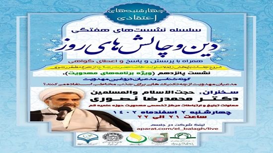 به گزارش روابط عمومی پژوهشگاه قرآن و حدیث، نشست علمی" گونه شناسی مدعیان دروغین مهدویت" با طرح پرسش " مدعیان مهدویت از چه تکنیک هایی برای جذب مخاطب استفاده می کنند؟" از پانزدهمین نشست از سلسله جلسات و نشست های "دین و چالش های روز"  ویژه "چهارشنبه های اعتقادی" از سوی پژوهشگاه قرآن و حدیث، انجمن کلام اسلامی حوزه، کمیته مرکزی کرسی های آزاداندیشی حوزه های علمیه و مرکز آموزش های کاربردی دفتر تبلیغات اسلامی قم با ارائه و سخنرانی حجت الاسلام و المسلمین دکتر محمدرضا نصوری، معاون تبلیغ و ارتباطات مرکز تخصصی مهدویت حوزه علمیه قم در روز چهارشنبه ۲ اسفند ماه ۱۴۰۲ از ساعت ۲۱ تا ۲۲ به صورت وبیناری برگزار می شود.