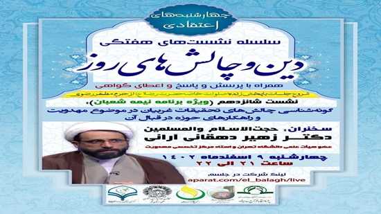 به گزارش روابط عمومی پژوهشگاه قرآن و حدیث، نشست علمی"گونه شناسی چالش های تحقیقات غربیان در موضوع مهدویت و راهکارهای حوزه علمیه در قبال آن"از شانزدهمین نشست از سلسله جلسات و نشست های "دین و چالش های روز"  ویژه "چهارشنبه های اعتقادی"از سوی پژوهشگاه قرآن و حدیث، انجمن کلام اسلامی حوزه، کمیته مرکزی کرسی های آزاداندیشی حوزه های علمیه و مرکز آموزش های کاربردی دفتر تبلیغات اسلامی قم با ارائه و سخنرانی حجت الاسلام و المسلمین دکتر زهیر دهقانی آرانی، عضو هیأت علمی دانشگاه تهران و استاد مرکز تخصصی مهدویت در روز چهارشنبه ۹  اسفند ماه ۱۴۰۲ از ساعت ۲۱ تا ۲۲ به صورت وبیناری برگزار می شود.