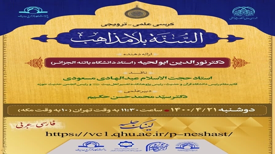 به گزارش روابط عمومی پژوهشگاه قرآن و حدیث، کرسی علمی ترویجی "السنة بلا مذاهب" با همکاری پژوهشگاهقرآن و حدیث، دانشگاه قرآن و حدیث، انجمن حدیث حوزه و دبیرخانه هیأت حمایت از کرسی­ های نظریه پردازی، نقد و مناظره شورای عالی انقلاب فرهنگی با سخنرانی دکتر نورالدین ابولحیه استاد دانشگاه باتنه کشور الجزایر و با حضور حجت الاسلام و المسلمین استاد عبدالهادی مسعودی قائم مقام رئیس دانشگاه قرآن و حدیث، رئیس پژوهشکده تفسیر اهل بیت علیهم السلام و رئیس انجمن حدیث حوزه به عنوان ناقد در روز دوشنبه ۲۱ تیر ماه از ساعت ۱۱:۳۰ تا ۱۳ به صورت وبیناری در سالن جلسات موسسه علمی فرهنگی دارالحدیث  برگزار می شود.