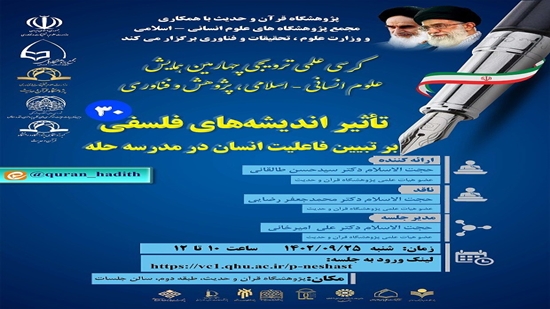 به گزارش روابط عمومی پژوهشگاه قرآن و حدیث، همزمان با هفته پژوهش ۱۴۰۲ در راستای چهارمین همایش علوم انسانی – اسلامی، پژوهش و فناوری، یازدهمین جلسه از سلسله نشست ها و سی اُمین کرسی علمی ترویجی پژوهشگاه با عنوان "تأثیر اندیشه­ های فلسفی بر تبیین فاعلیت انسان در مدرسه حله"با حضور حجت الاسلام دکتر سیدحسن طالقانی، عضو هیأت علمی پژوهشگاه قرآن و حدیث به عنوان ارائه کننده و حجت الاسلام دکتر محمدجعفر رضایی، عضو هیأت علمی پژوهشگاه قرآن و حدیث به عنوان ناقد و حجت الاسلام دکتر علی امیرخانی، عضو هیأت علمی پژوهشگاه قرآن و حدیث به عنوان مدیر جلسه، با مشارکت و همکاری مجمع پژوهشگاه های علوم انسانی - اسلامی و وزارت علوم، تحقیقات و فناوری و دبیرخانه هیات حمایت از کرسی های نظریه پردازی، نقد و مناظره شورای عالی انقلاب فرهنگی و کمیته دستگاهی پژوهشگاه و دانشگاه قرآن و حدیث در روز شنبه ۲۵ آذر ماه ۱۴۰۲ از ساعت ۱۰ تا ۱۲ به صورت حضوری و وبیناری در سالن جلسات پژوهشگاه قرآن و حدیث برگزار می شود.