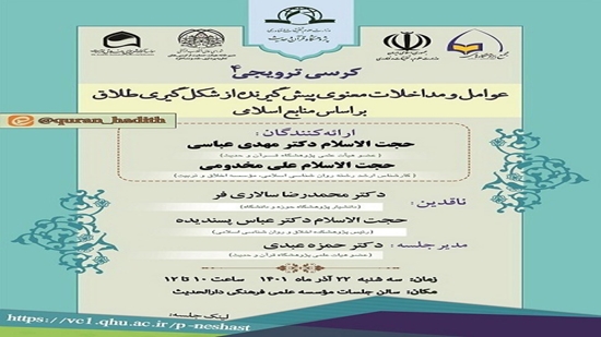 به گزارش روابط عمومی پژوهشگاه قرآن و حدیث، همزمان با هفته پژوهش و در راستای سومین همایش علوم انسانی – اسلامی، پژوهش و فناوری، کرسی علمی ترویجی "عوامل و مداخلات معنوی پیش گیرنده از شکل گیری طلاق بر اساس منابع اسلامی" به همت پژوهشکده اخلاق و روان شناسی اسلامی پژوهشگاه قرآن و حدیث و با مشارکت معاونت پژوهشی وزارت علوم، تحقیقات و فناوری و مجمع پژوهشگاه های علوم انسانی – اسلامی و دبیرخانه هیات حمایت از کرسی های نظریه پردازی، نقد و مناظره شورای عالی انقلاب فرهنگی، با ارائه و سخنرانی حجت الاسلام دکتر مهدی عباسی، عضو هیات علمی پژوهشگاه قرآن و حدیث و حجت الاسلام علی مخدومی، کارشناس ارشد رشته روانشناسی اسلامی مؤسسه اخلاق و تربیت و با حضور دکتر محمدرضا سالاری فر، دانشیار پژوهشگاه حوزه و دانشگاه و حجت الاسلام دکتر عباس پسندیده، رئیس پژوهشکده اخلاق و روان شناسی اسلامی به عنوان ناقدین و دکتر حمزه عبدی، عضو هیات علمی پژوهشگاه قرآن و حدیث به عنوان مدیر جلسه، در روز سه شنبه ۲۲ آذر ماه ۱۴۰۱ از ساعت ۱۰ تا ۱۲  به صورت حضوری و وبیناری در سالن جلسات موسسه علمی فرهنگی دارالحدیث برگزار می شود.