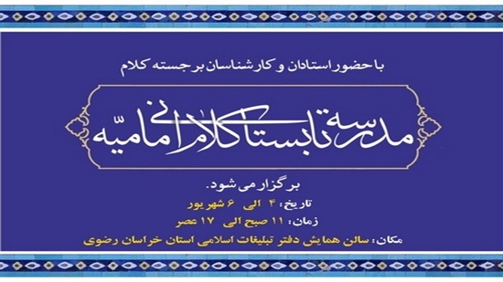 مدرسه تابستانی کلام امامیه از سوی دفتر تبلیغات اسلامی استان خراسان رضوی، انجمن کلام اسلامی حوزه علمیه و پژوهشکده کلام اهل بیت(ع) پژوهشگاه قرآن و حدیث از 4 الی 6 شهریور در مشهد برگزار خواهد شد.